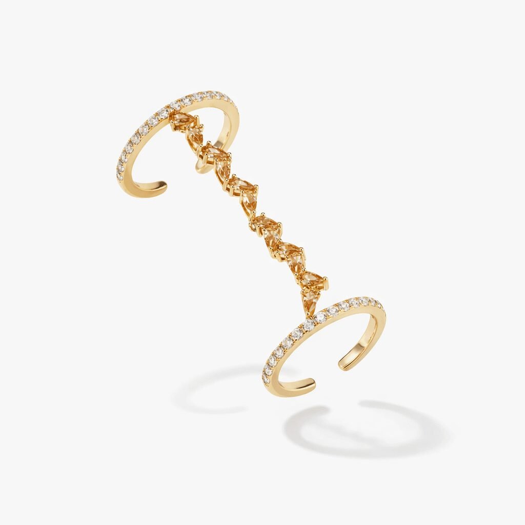 Crafted in luminous 18k gold vermeil, the duo pairs a sleek pavé band with a sculptural gemstone band that appears to float across the finger. The marquise stones are set in a graceful, vine-like progression—each facet angled to amplify golden warmth and subtle fire. The open-ended design gives the piece an airy, couture feel while allowing for comfortable micro-adjustment, making this adjustable open ring set ideal for styling across different fingers or stacking with your everyday favorites.