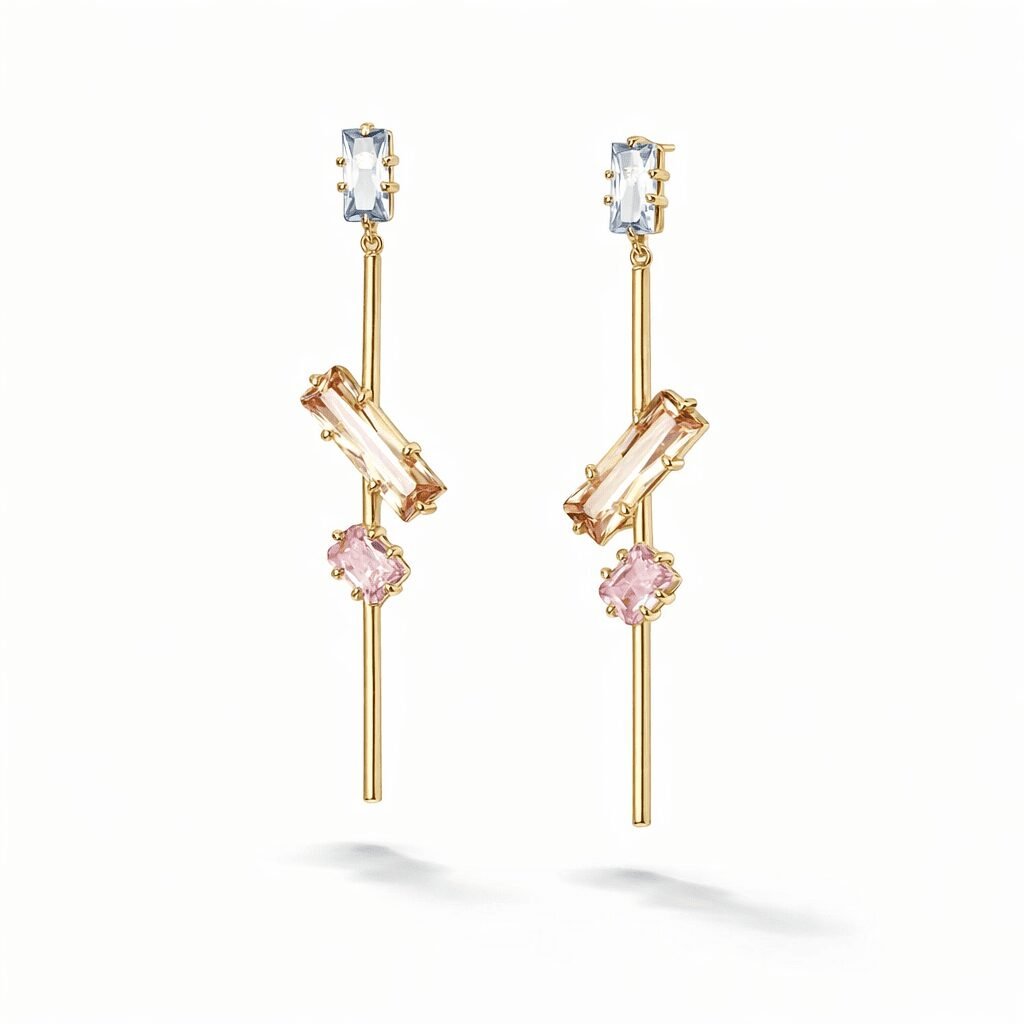 At a glance, the composition feels like a curated gallery of light: crisp edges, precise angles, and transparent color that reads as sophisticated rather than loud. The top stone anchors the ear with a cool, glassy sparkle; below it, the diagonal baguette introduces a subtle sense of movement; and the pink crystal adds a romantic note that flatters every skin tone. Each stone is prong-set to maximize luminosity, while the slender bar elongates the neck for a poised, couture finish. If you love jewelry that looks minimal from afar and mesmerizing up close, these drop earrings are made for you.
