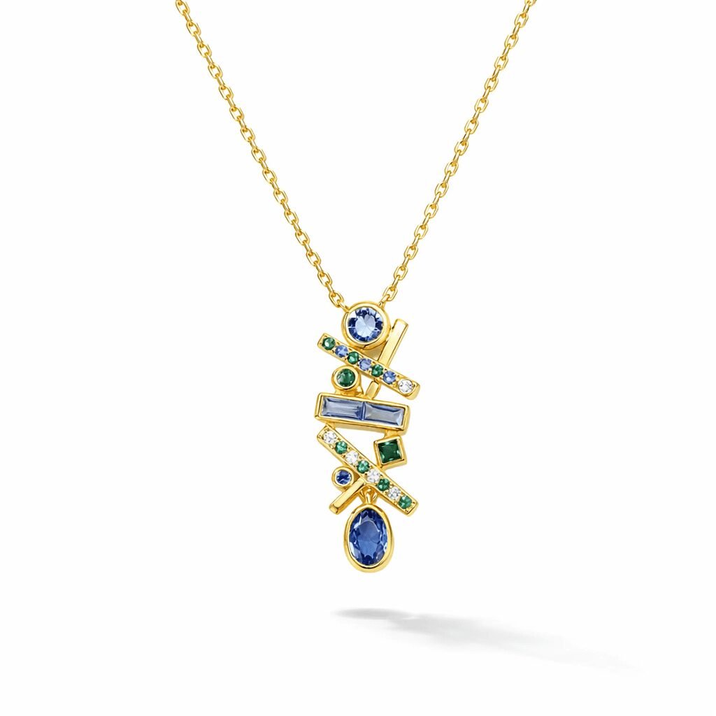 This gold pendant necklace with blue stone is designed for the woman who prefers her sparkle with structure—clean lines, intentional asymmetry, and color placed with confidence. At its center, a vertical pendant stacks cool-toned stones into a modern totem: deep sapphire-blue drops, crisp baguette-like blues, and vivid green accents, all framed by warm gold. The result is a piece that reads refined at a glance, yet reveals detail and artistry the closer you look.