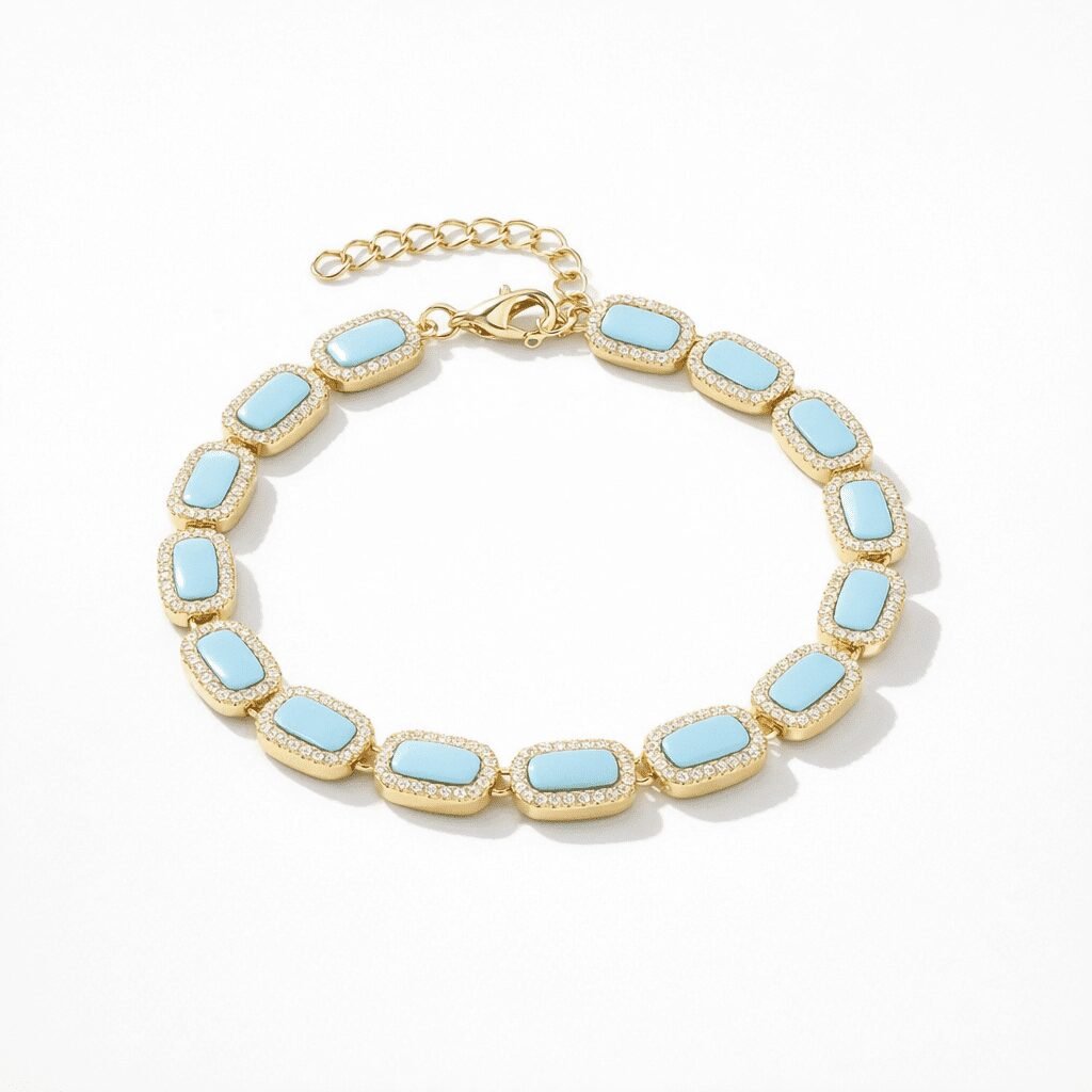 This blue station tennis bracelet plays with contrast: cool color against warm metal, high shine against pavé texture, and a clean geometric outline softened by rounded corners. The result is a piece that feels contemporary yet timeless—an accessory that looks equally at home with a white shirt cuff, a silk slip dress, or a tailored blazer.
