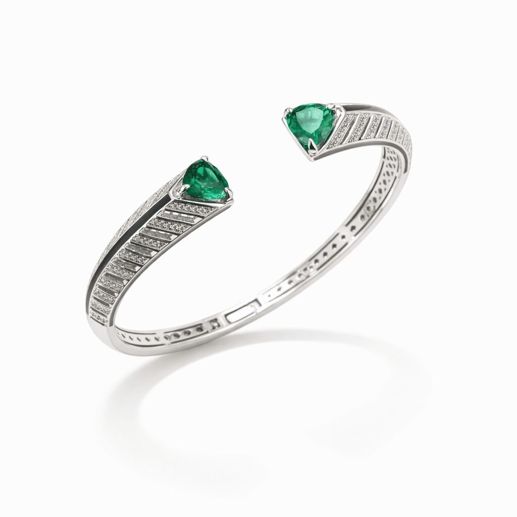 Inspired by contemporary architecture and the elegance of symmetry, this bangle is a study in balance—two green points of light meeting across a luminous arc. The triangular stones evoke modern geometry, while the band’s tapered lines recall classic high-jewelry silhouettes, reimagined for today. It’s the kind of piece that feels curated from a private collection: distinctive, disciplined, and undeniably refined.
