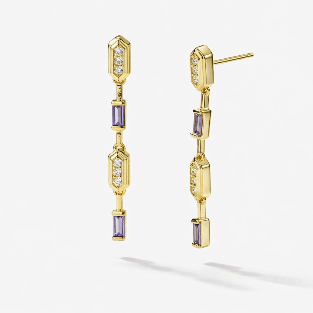 Crafted with a polished gold silhouette, the design alternates between two distinct elements: an elongated, shield-like station set with three sparkling clear crystals, and a clean rectangular setting holding a violet baguette-cut stone. The result is a balanced composition—structured, precise, and undeniably luxurious. The drop length creates an elegant sway, while the straight lines keep the look sharp and contemporary. Finished with a classic post backing, these earrings sit securely and frame the face with effortless sophistication.