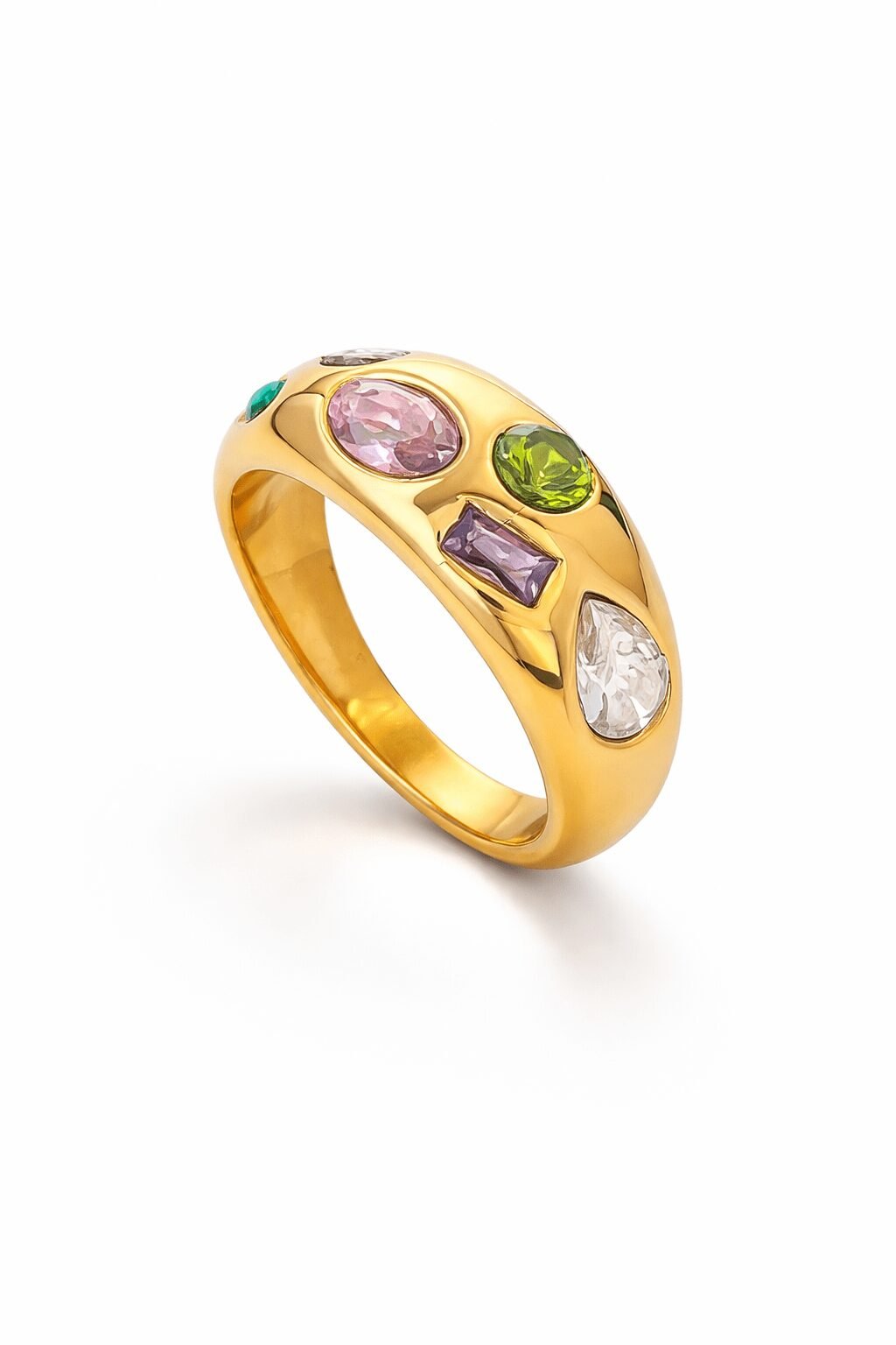Sculptural gemstone ring in 18k gold vermeil with blush, green, lilac and clear stones. A bold, comfort-fit statement for modern luxury.