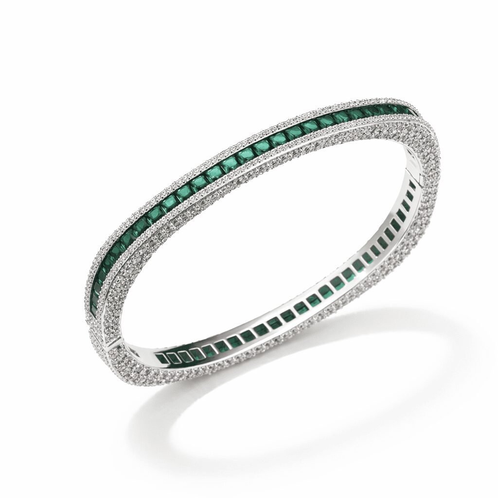 This silver bangle bracelet with green stones is made to be worn often and admired always. The channel setting is designed to keep the green stones aligned and protected, while the pavé detailing is placed to maximize brilliance without compromising the clean silhouette. The rigid bangle form helps the piece sit elegantly on the wrist, maintaining its shape and presence over time. It’s a modern investment in polish—crafted for longevity, comfort, and enduring style.